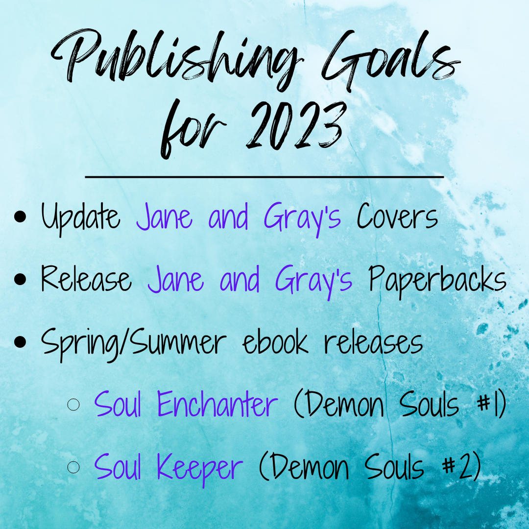 My publishing goals for 2023 are the same as what I posted in my November wrap up. I want to update Jane and Gray’s covers and release the paperbacks and have a summer/fall ebook release for the first two books in my Demon Souls series. I’m adding a few non-publishing goals for 2023, too. I’d like to have a complete first draft for Liz’s first book and have close to completed first drafts for Liz’s second book, Rose’s novella, Devil’s novella, and Rage’s spinoff. Those are pretty big goals so we’ll see what happens! If I can do that, then I’ll be in really good shape for 2024!