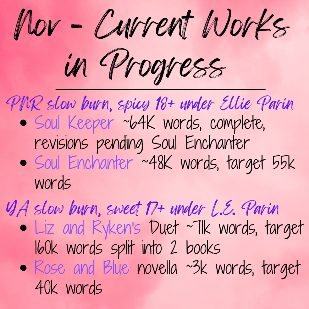 Alright—onto the writing recap for November! My muse finally decided to cooperate with Soul Enchanter, the first book in my paranormal romance Demon Souls series. ICYMI, that’s the book I had mostly finished and lost when my computer died several years ago, and I couldn’t get the motivation to rewrite it. Funny enough, I finished the second book, Soul Keeper, even though I wasn’t sure if I’d even go back and write the first book! I’m mostly done with the first draft of book 1, so I took book 2 back out of the beta read stage so I can make some minor revisions to line up with book 1 better. This means, I should still be able to release the first two books in the trilogy in 2023. I’m not sure if I’ll be able to get book 3 out next year, since I’m trying to work up to two releases a year. But each book is standalone, so hopefully no one will mind if there’s a delay between book 2 and 3!