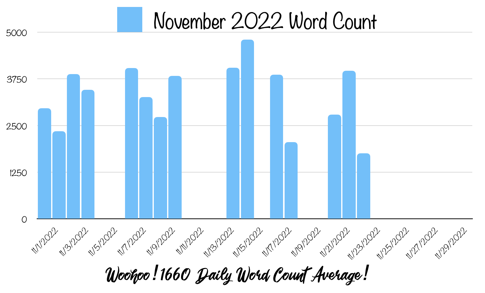 Happy holidays! I hope you had a wonderful Thanksgiving if you celebrate! We enjoyed the day with family time and tried not to overstuff ourselves with food! I didn’t think I’d get much writing done because of the holidays, but I ended up doing my personal best of an average per day word count of 1,660 words!
