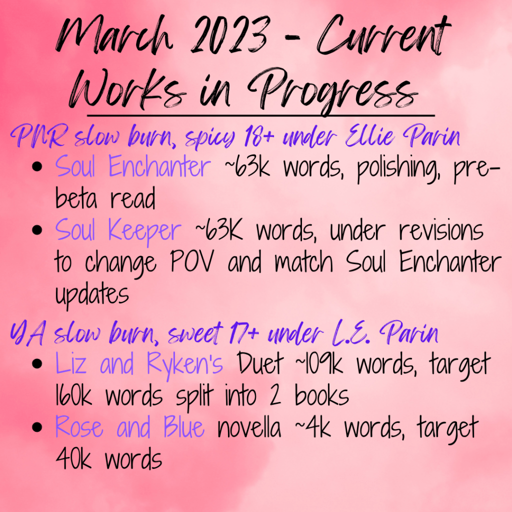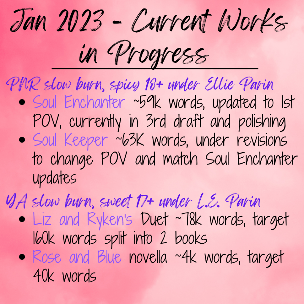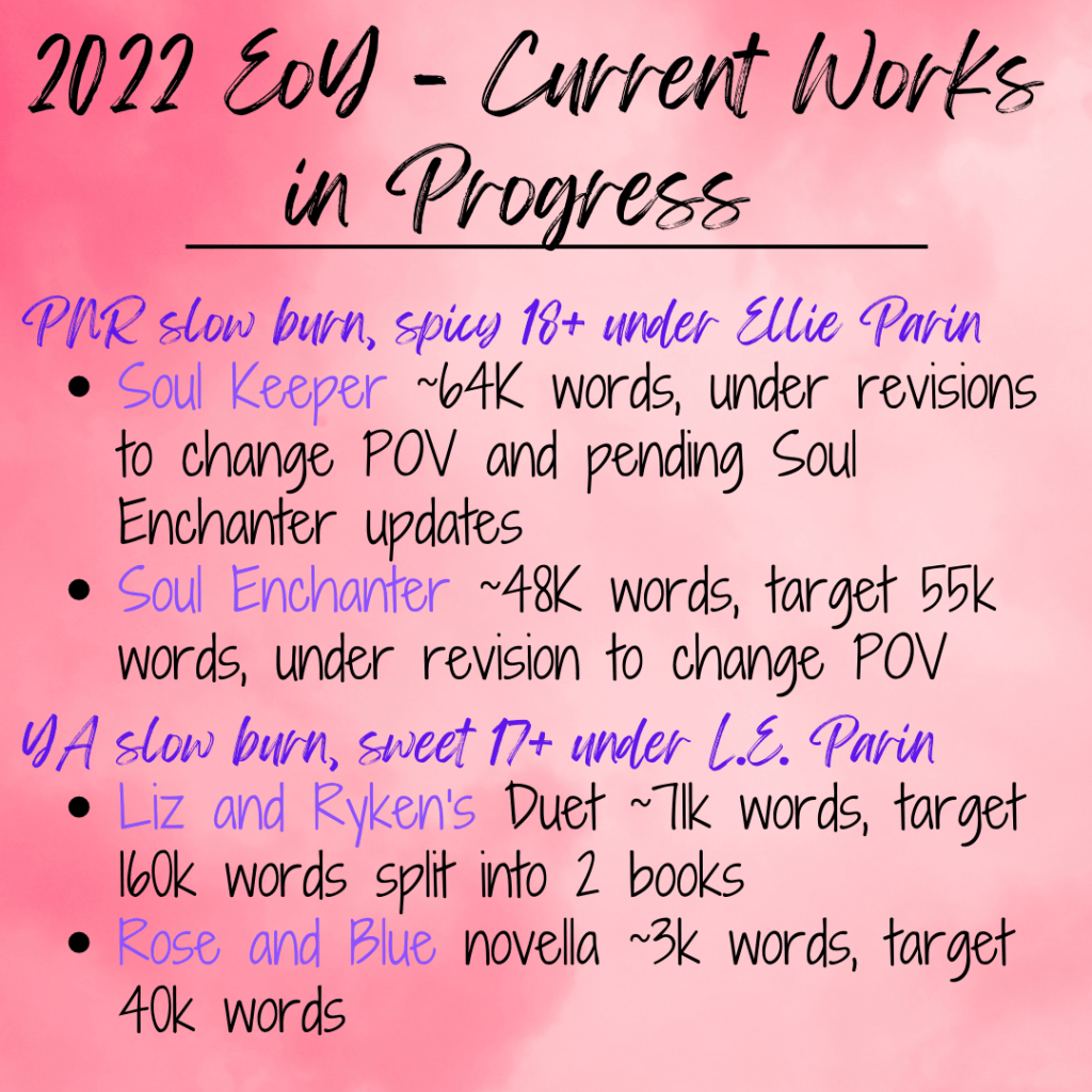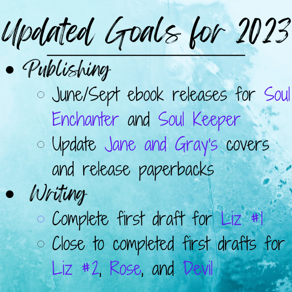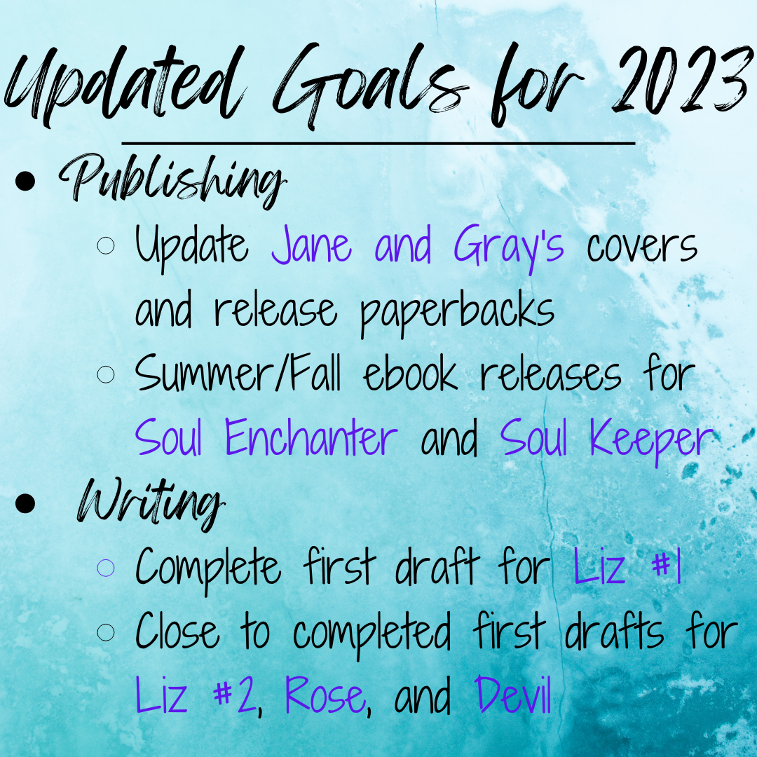 For my 2023 goals, nothing much has changed although Jane and Gray’s covers and paperbacks are firmly on the back-burner. At this point, I feel like it’s become a running gag that I’m getting them out, because I can’t seem to find the inspiration and time to sit down and get those covers done! I am still planning on releasing my adult paranormal romances Soul Enchanter and Soul Keeper this year with tentative target months of June and Sept, respectively! I might push up the third book in the Soul Enchanter’s series on my WiP list depending on how well the first two do, but right now the third book is slated for 2026. In my young adult Anderson Grimm Academy of Elites series, I’m still hoping to have Liz’s duet, Rose’s novella, and Devil’s novella mostly written by the end of year so that I’ll be in a good spot for next year’s releases.