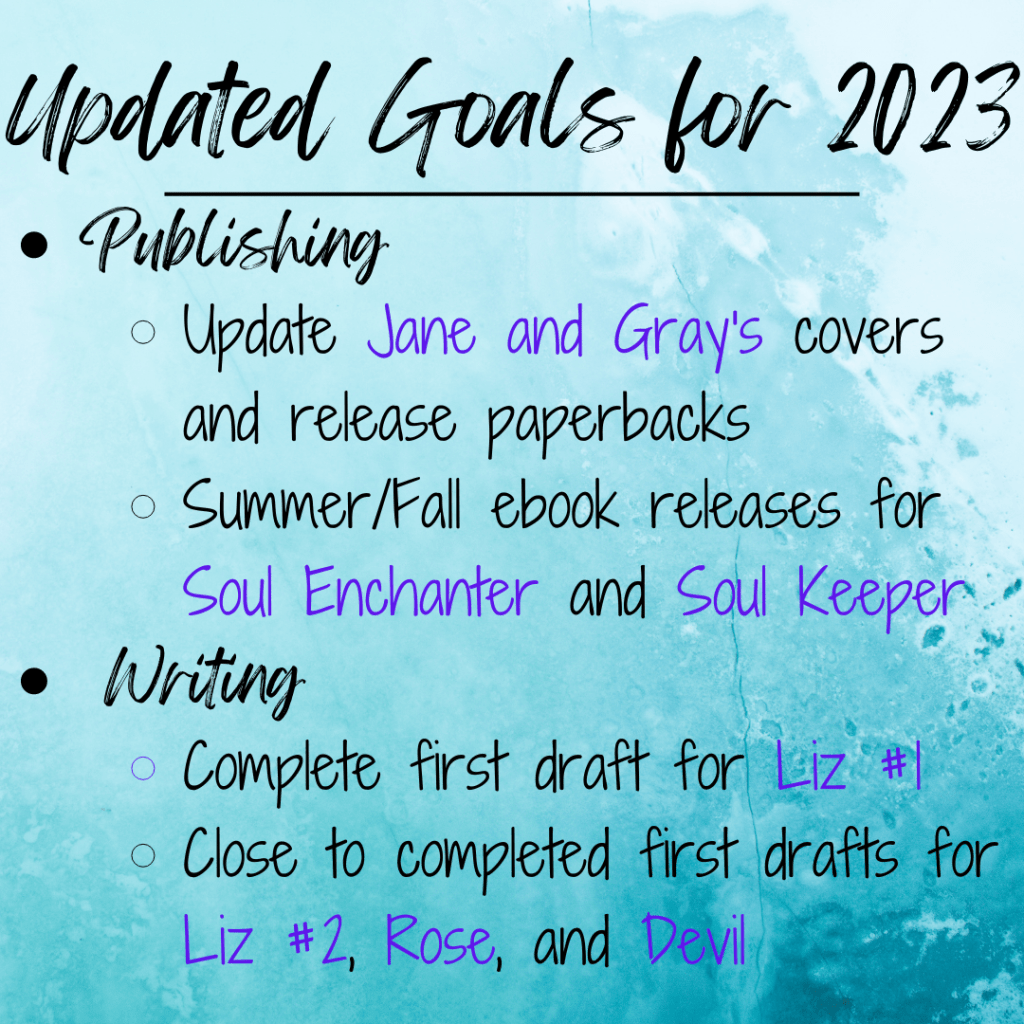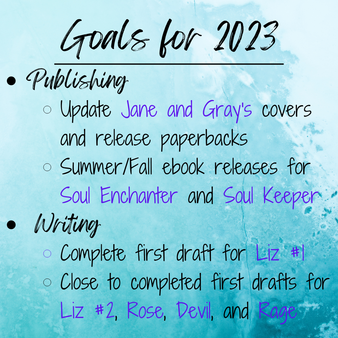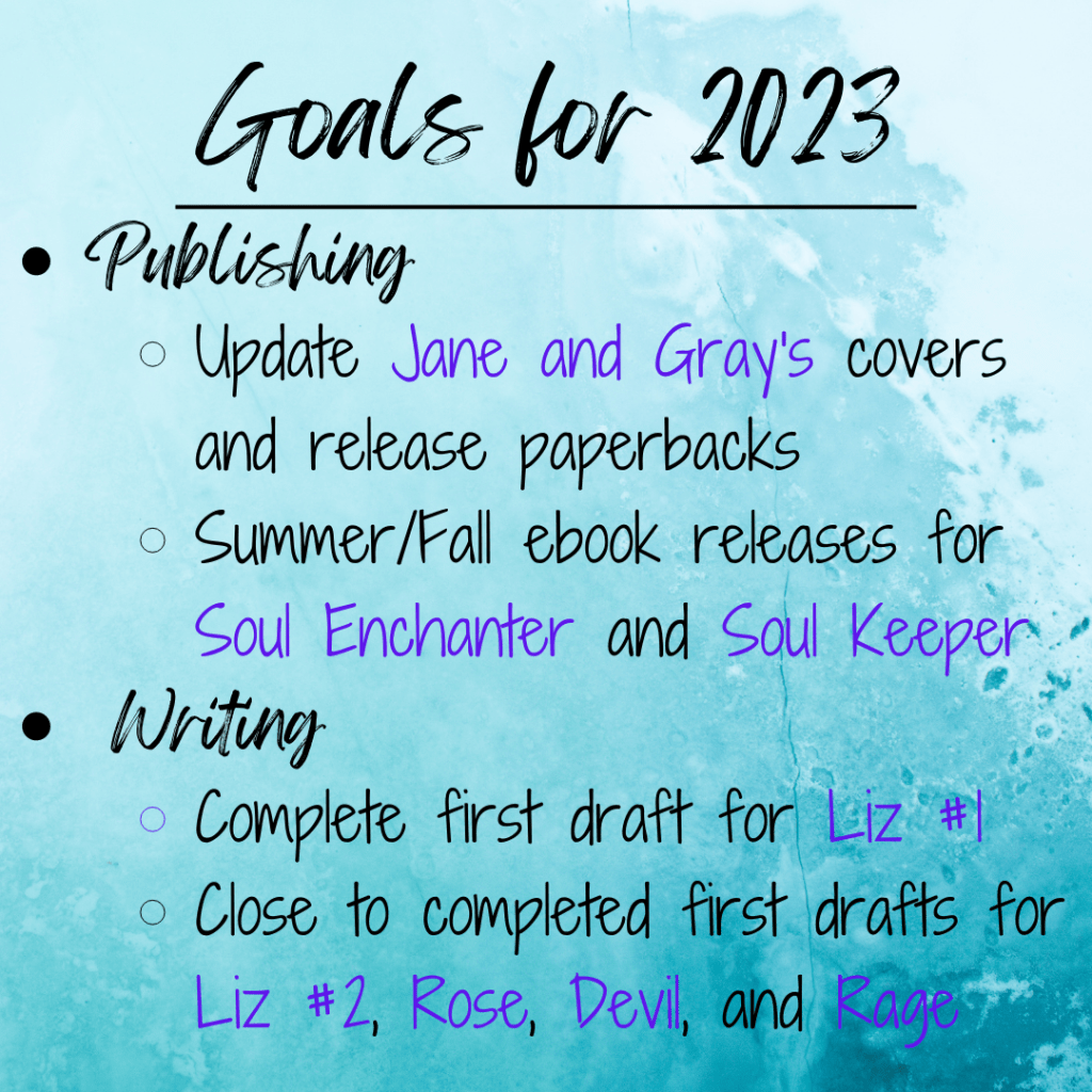 My publishing goals for 2023 are the same as what I posted in my November wrap up. I want to update Jane and Gray’s covers and release the paperbacks and have a summer/fall ebook release for the first two books in my Demon Souls series. I’m adding a few non-publishing goals for 2023, too. I’d like to have a complete first draft for Liz’s first book and have close to completed first drafts for Liz’s second book, Rose’s novella, Devil’s novella, and Rage’s spinoff. Those are pretty big goals so we’ll see what happens! If I can do that, then I’ll be in really good shape for 2024!